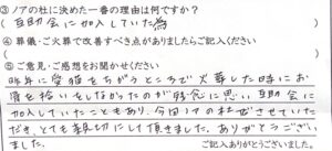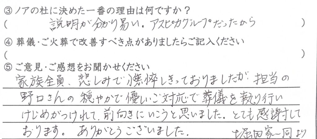 -家族全員、悲しみで憔悴しきっておりましたが担当の野口さんの穏やかで優しいご対応で葬儀を執り行いけじめがつけられて前向きにいこうと思いました。とても感謝しております。ありがとうございました。 堀田家一家より