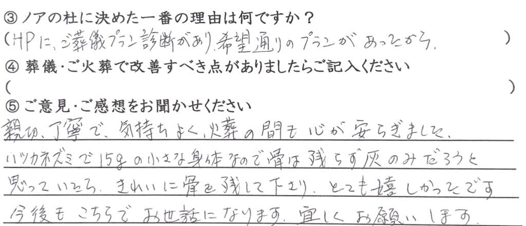 ハツカネズミで15gの小さな身体なので骨は残らず灰のみだろうと思っていたらきれいに骨を残して下さり、とても嬉しかったです。今後もこちらでお世話になります。宜しくお願いします。