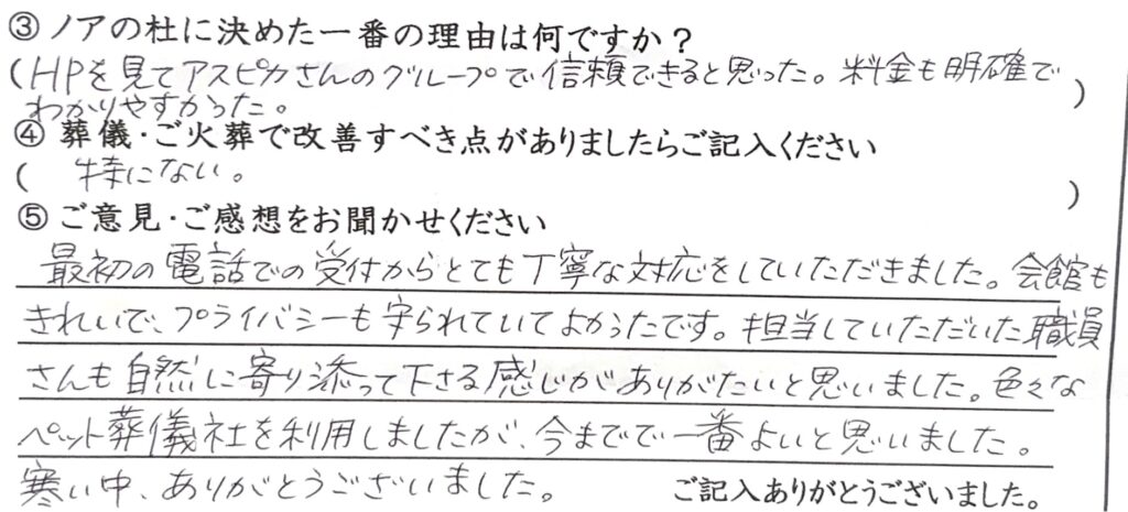 -最初の電話での受付からとても丁寧な対応をしていただきました。会館もきれいでプライバシーも守られていてよかったです。担当していただいた職員さんも自然に寄り添って下さる感じがありがたいと思いました。色々なペット葬儀社を利用しましたが今までで一番よいと思いました。寒い中ありがとうございました。