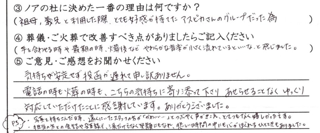 電話の時も火葬の時も、こちらの気持ちに寄り添って下さりあせらせることなく